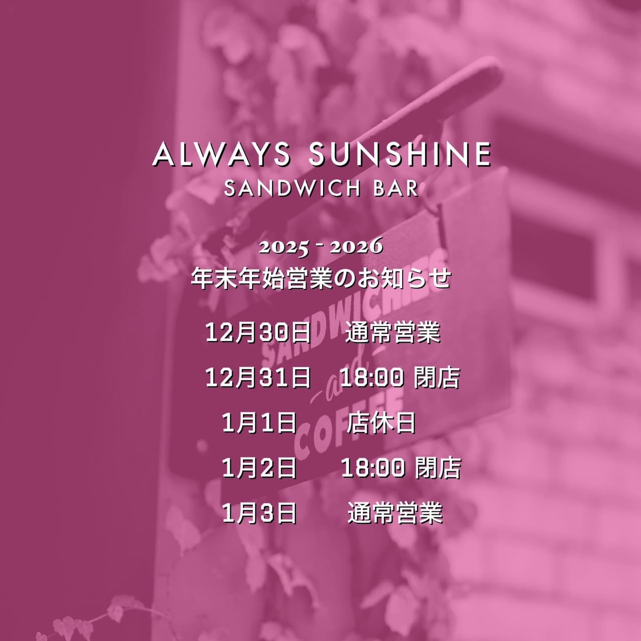 2025年も残すところわずかとなりました。本年もALWAYS SUNSHINEをご利用いただき、誠にありがとうございます。
